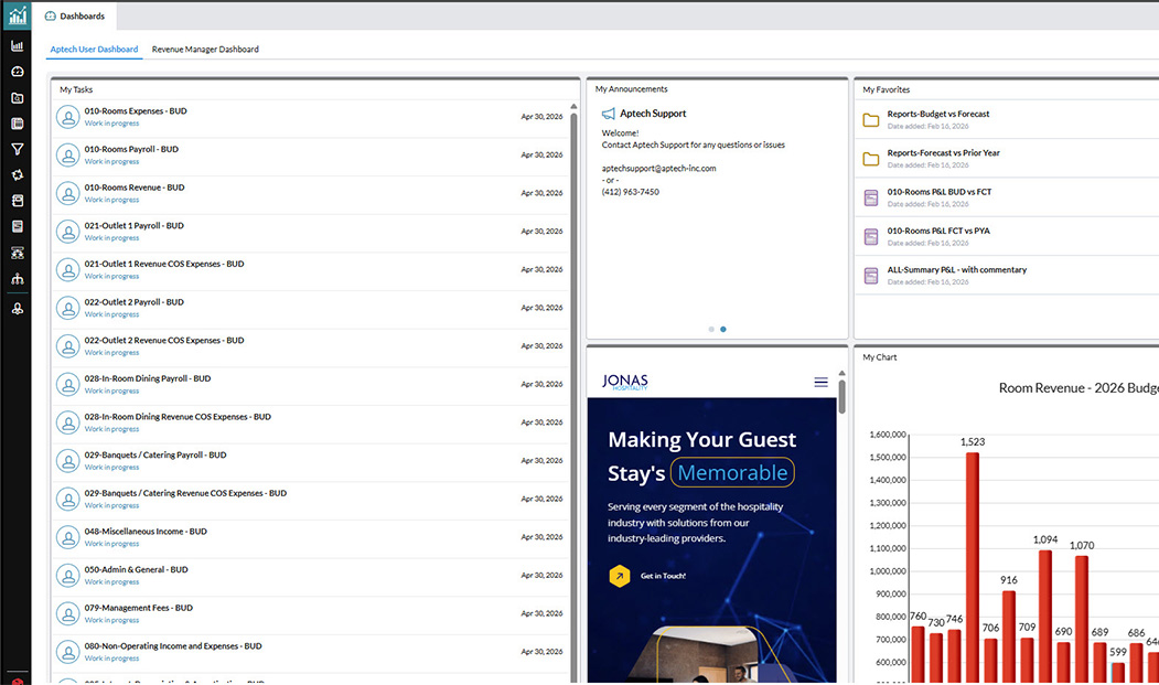 Aptech’s solutions are 100 percent hotel-specific and include Execuvue business intelligence, PVNG scalable accounting, and TVNG budgeting and forecasting. All applications can operate stand-alone or be fully integrated with the entire Aptech financial suite. Our clients comprise over 3,500 properties, ownership groups, multiple-property management companies and single-site hotels.